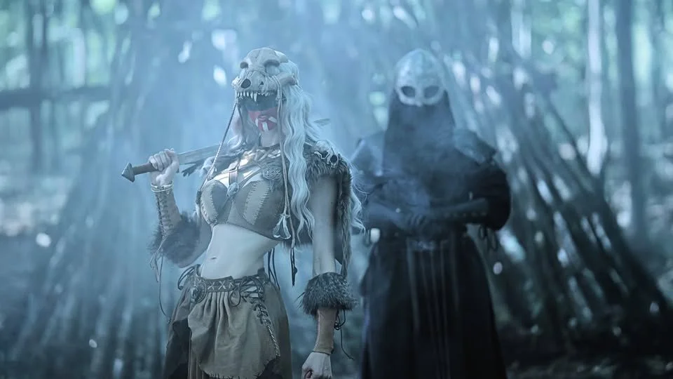 This dimension is particularly evident in pieces such as Baldr, where the stage presence of Asrunn assumes an almost sacerdotal quality. Her performance, including her use of percussion instruments such as the tambourine, contributes to a carefully constructed ritual aesthetic. The drummer, Mark, complements this dynamic with a physical intensity that recalls the archetype of the warrior, reinforcing the performative cohesion of the ensemble.